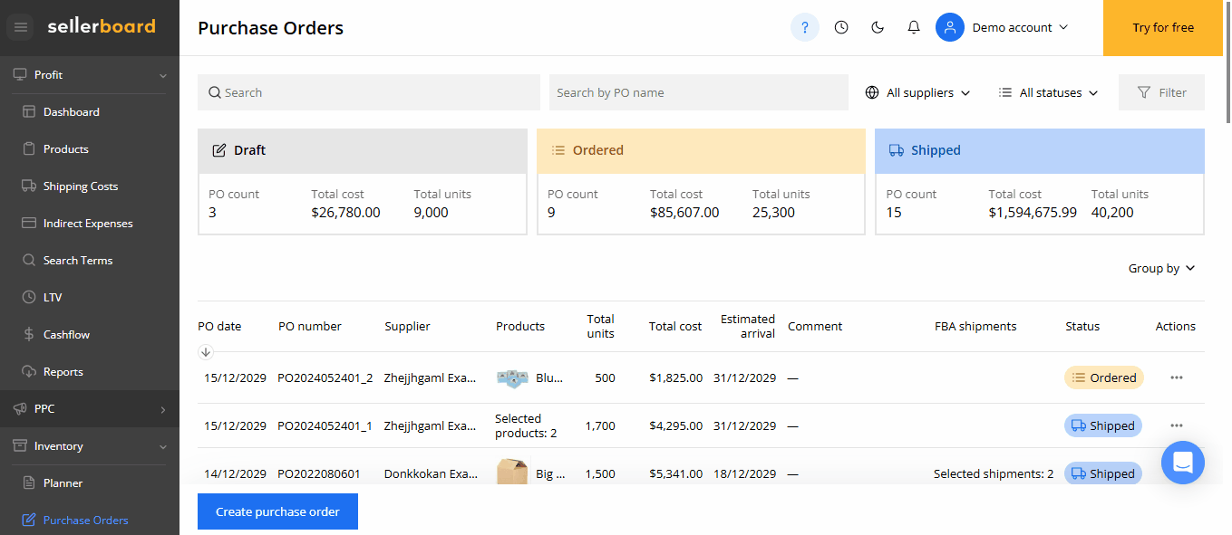 This is especially useful when boxes arrive on different dates or when only part of an order is ready for FBA. Instead of juggling updates in one PO, each shipment gets its own document — all still linked to the original order.